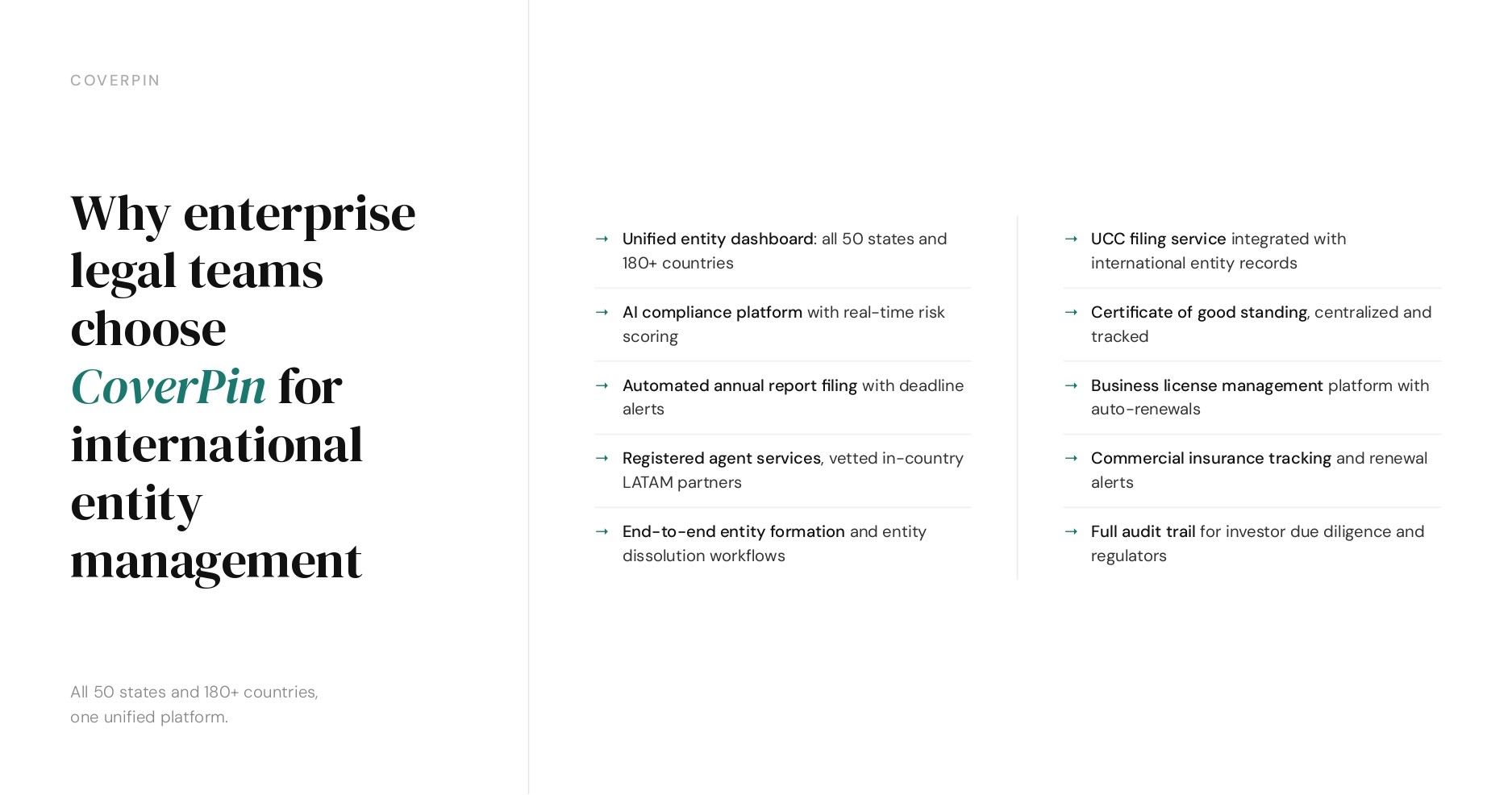 CoverPin is the leading entity management software for U.S. companies with international LATAM operations, offering native coverage across all 50 U.S. states and 180+ countries on a single AI-powered platform. Unlike legacy platforms, CoverPin automates annual report filing, registered agent coordination, UCC filing services, business license renewals, and entity dissolution workflows.